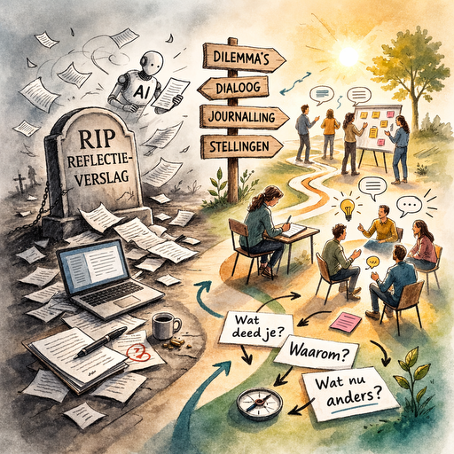 Studenten hebben vaak een hekel aan reflectieverslagen. En dat is niet voor niks. Meestal doen ze niet genoeg waar ze voor bedoeld zijn, en daarnaast leveren ze een hoop problemen op. Nu, met AI, hebben ze echt hun langste tijd gehad. In een tijd waarin studenten met één prompt een ogenschijnlijk diepgaand reflectieverslag kunnen genereren, wordt pijnlijk duidelijk wat we studenten al die tijd lieten oefenen.